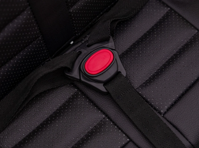 Malí řidiči si užijí plynulý rozjezd, volbu 2 rychlostí a jízdu vpřed/vzad. Bohaté LED osvětlení (přední, zadní i horní) a podsvícené startovací tlačítko s efektem zvuku motoru dotváří realistický zážitek. Interiér nabízí černé sedadlo z ekokůže s pásy, otevírací dveře a přehledný panel s MP3/USB/AUX/Bluetooth a vestavěnými melodiemi.