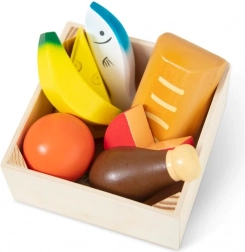 Tato dřevěná sada potravin obsahuje čtyři malé krabičky, které ukrývají různé potraviny jako mléko, sýr, a chléb. Je navržena pro kreativní hraní, které pomáhá dětem rozvíjet jemnou motoriku a představivost.