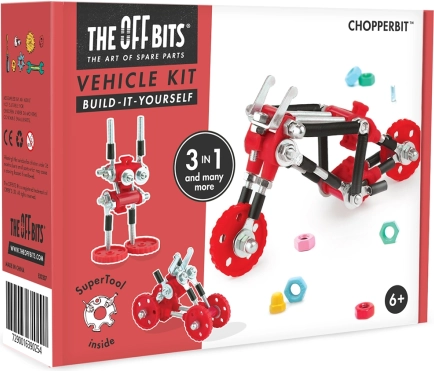 Stavebnice The OffBits ChopperBit přináší zábavné a vzdělávací tvoření pro děti od 6 let. Z dostupných šroubků, koleček a chytrých spojů postavíte ChopperBit, robota TechBit nebo BumperBit – a pak se můžete pustit do vlastních originálních nápadů. Díly lze kombinovat s běžnými materiály z domácnosti, takže se kreativním možnostem meze nekladou.