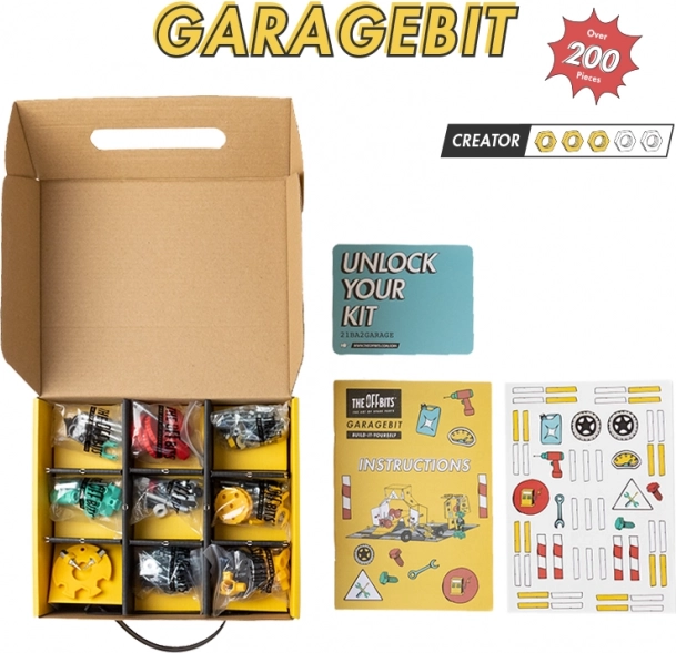 Udržujte svá vozidla ve špičkovém stavu s GarageBit, který obsahuje barevné matice, šrouby, tvarované kousky a samolepky. Toto balení nestačí být pouze součástí herního zážitku, ale stane se plně funkční garáží, čerpací stanicí a opravnou. Rozvíjejte svou kreativitu a fantazii vytvářením třech modelů a mnoha dalších dle vašich nápadů.