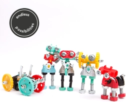 S touto stavebnicí není problém vytvořit roboty, auta nebo neobvyklé vynálezy. Můžete do tvorby zapojit fantazii a různé recyklovatelné materiály jako karton nebo šroubky.