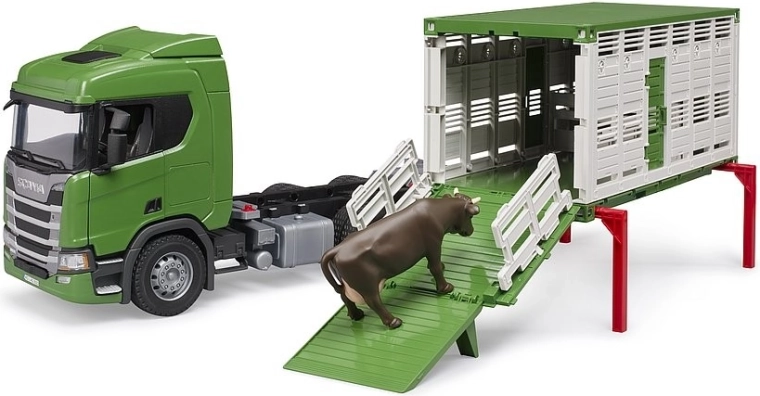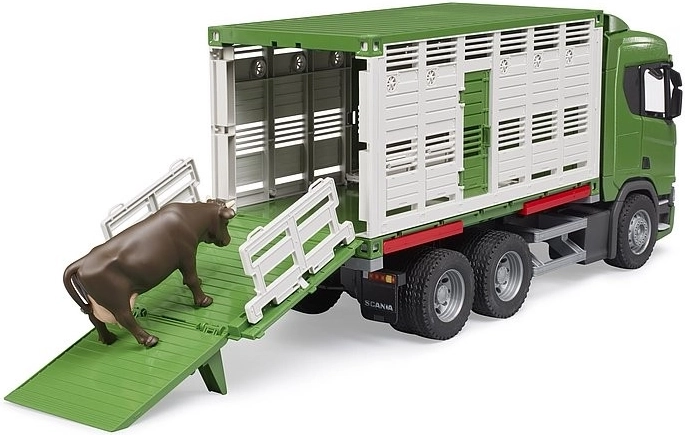 Realistický přepravník zvířat BRUDER na podvozku SCANIA potěší malé farmáře skvělými funkcemi a pevným zpracováním. Nabízí sklopné a výsuvné rampy, otevírací dveře, sklopná zrcátka i vnitřní dělící brány. Součástí je figurka krávy, měkké běhouny pneumatik pro tichou jízdu a možnost doplnění o světelný a zvukový modul pro ještě větší zážitek ze hry.