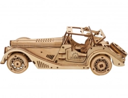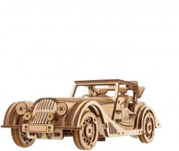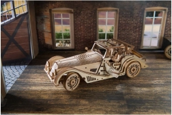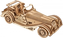 Model vyniká detailním interiérem, otevíracími bočními dveřmi, ručně ovládanou pevnou střechou se střešním oknem a funkčním rezervním kolem v kufru. V balení najdete vše potřebné – díly jsou předřezané a sestavení zvládnete podle ilustrovaného návodu ve 11 jazycích. Ponechte přírodní dřevo, nebo si vůz namalujte dle vlastní fantazie.
