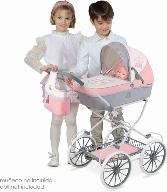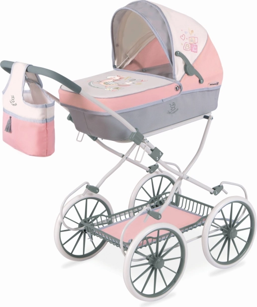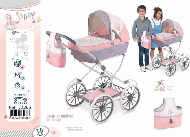 DeCuevas 80086 Skládací kočárek pro panenky s taškou FUNNY 2023 - 81 cm patří do stejnojmenné veselé kolekce FUNNY, která je novinkou roku 2023 a nabízí kromě různých druhů kočárků pro panenky i další doplňky pro budoucí maminky, hospodyňky a tatínky. Této velmi veselé kolekci vévodí roztomilý houpací koník s pruhovaným sedlem a barevnými hracími kostkami. Některé modely nalezneme ve sladěných barvách pastelově růžové s šedavou a smetanovou a jiné v mentolově zelené s šedavou a smetanovou barvou. Obě kombinace však působí velmi svěže a hravě.