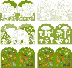 Připravte pastelky pro rozkošná zvířátka s touto omalovánkou V lese, která přináší výjevy jako rodinku jelenů či medvědí sourozence. Po vybarvení lze scény dozdobit barevnými samolepkami.