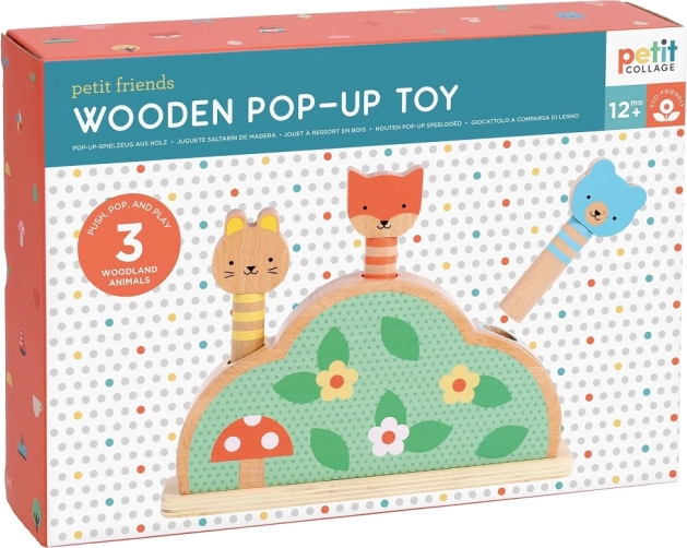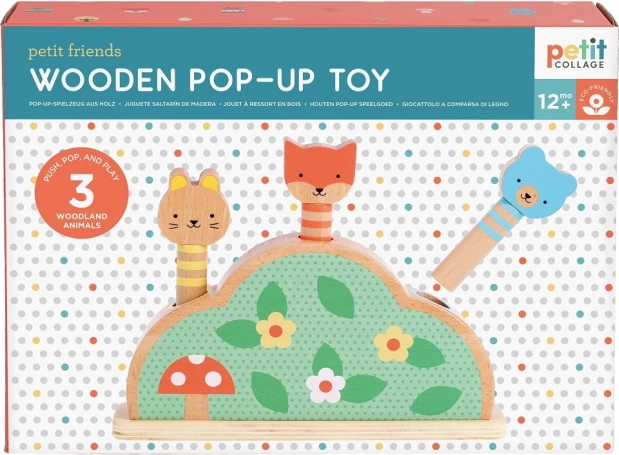 Objevte hravou a bezpečnou zábavu pro nejmenší s dřevěnou vyskakovací hračkou PETIT COLLAGE. Tři lesní zvířátka na pružinách čekají, až je děti stisknou a nechají vyskočit – skvělá aktivita pro rozvoj jemné motoriky, koordinace oko–ruka a pochopení příčiny a následku. Vyrobeno z FSC® certifikovaného dřeva, potištěno netoxickými inkousty na vodní bázi a zabaleno v ekologickém obalu.