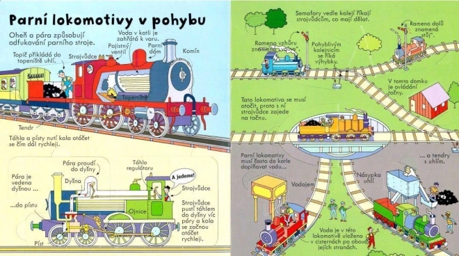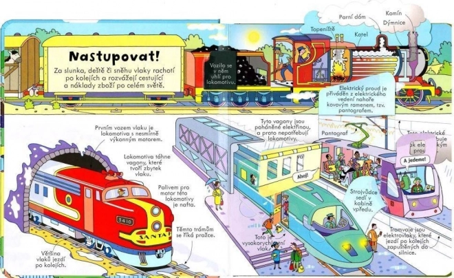 Čtenáři se dozvědí, jak se vyvíjely vlaky od parních obrů až po moderní vysokorychlostní soupravy, nahlédnou do provozu metra, zjistí, jak lokomotivy táhnou těžké náklady a jak vlaky zdolávají kopce. Interaktivní forma podporuje přirozenou zvídavost a rozvíjí znalosti i slovní zásobu.