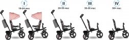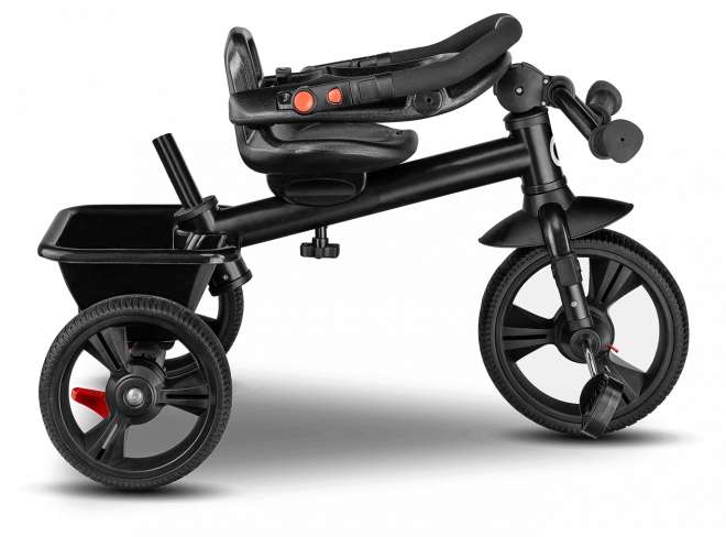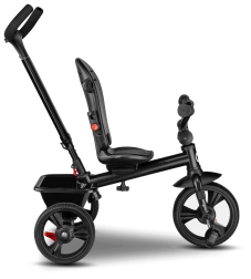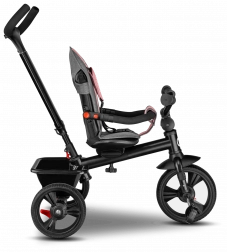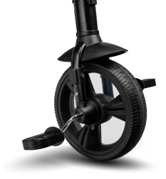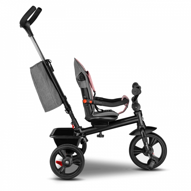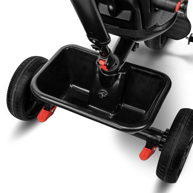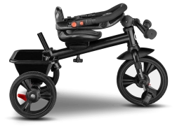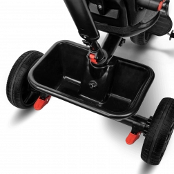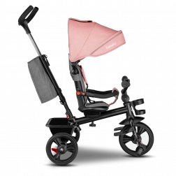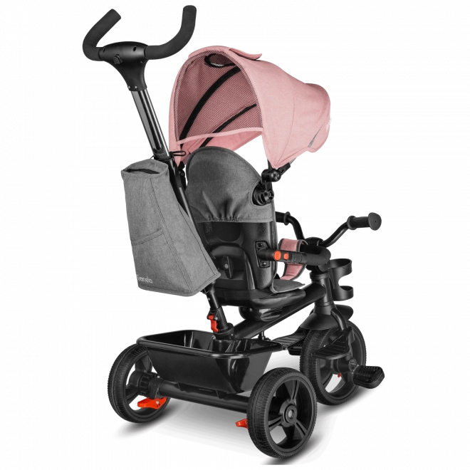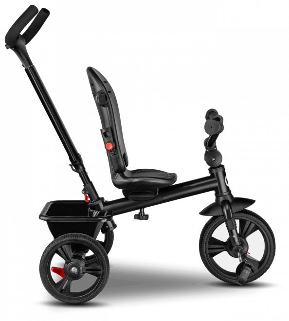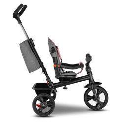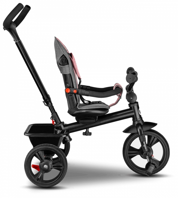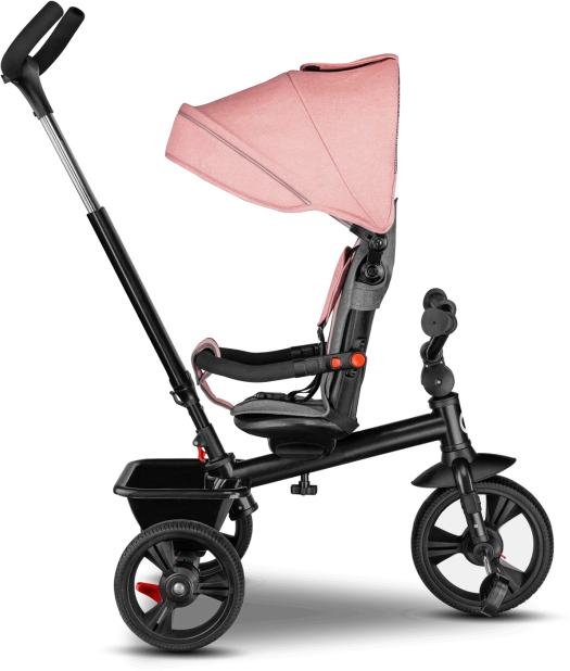 Pro maximální pohodlí je tu nastavitelná stříška s průhledovým okénkem, polohovatelná rukojeť pro rodiče a praktická výbava – košík, taška a držák na láhev. Bezpečnost zvyšují 3bodové pásy, madlo, reflexní prvky a dva nezávislé zadní brzdové mechanismy. Tříkolka se snadno skládá do kompaktní velikosti a po složení ji lze pohodlně přenášet díky integrované rukojeti.