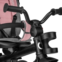 Dvě zadní brzdy, 3bodové pásy, madlo a reflexní prvky zvyšují bezpečnost. Košík, taška a držák na láhev usnadní každodenní použití.