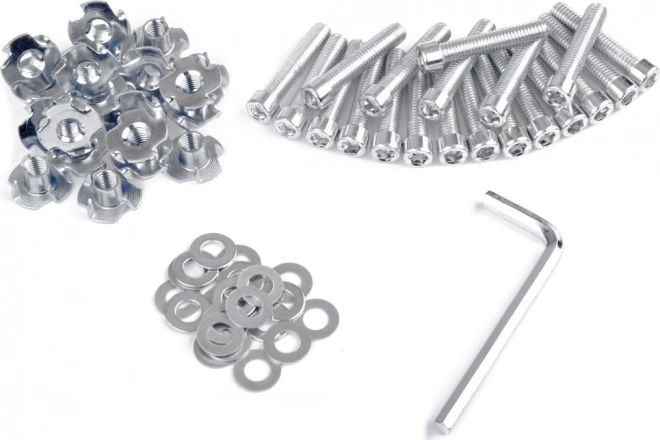 Montážní sada obsahuje všechny potřebné kovové komponenty včetně šroubů, podložek a imbusového klíče pro pevnou instalaci.