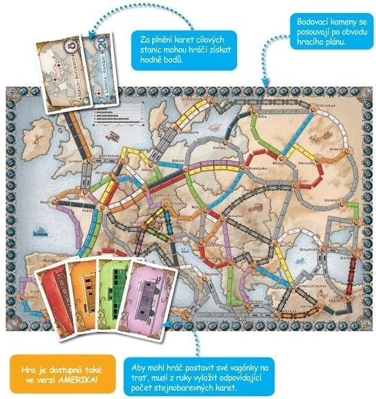 Jízdenky, prosím! Evropa je oblíbená strategická hra o budování železnic, kde hráči sbírají barevné karty vagónů, aby stavěli nádraží, propojovali tratě a překonávali různé překážky jako tunely a trajekty. Se svými jednoduchými pravidly vytváří prostor pro napínavý konkurenční boj, kde taktika a riskování hrají klíčovou roli.
