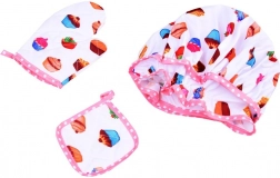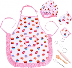 Tato kompletní sada pro malé kuchaře je ideální pro první pečení sušenek i hraní na cukráře. Lehká zástěra s veselým cupcake motivem chrání oblečení, zatímco čepice a rukavice dodají dětem pocit profesionality. Díky reálným nástrojům jako je dřevěná lžíce, váleček, metla a kovová vykrajovátka si děti bezpečně vyzkouší základní kuchařské dovednosti.