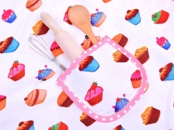Zástěra a doplňky s barevným cupcake vzorem a růžovými volánky chrání oblečení a dodají vaření zábavný styl.