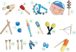 - Škrabka (2×), dřívka (2×), kastaněty (2×), maracas (2×), triangl, tamburína, flétna, rolničky, janissary/číňany – různé provedení (více kusů), čelenka s rolničkami