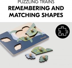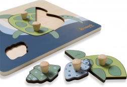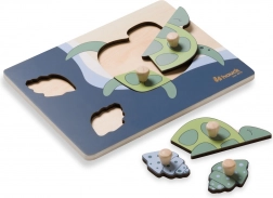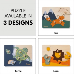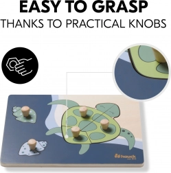 Dřevěné puzzle s úchyty Turtle je navrženo pro malé dětské ruce. Každý dílek má dřevěný knoflík pro snadné uchopení a přesné vložení. Skládáním dítě trénuje jemnou motoriku, koordinaci oka a ruky, paměť a vnímání tvarů a barev. Zaoblené hrany zajišťují bezpečné hraní už od 12 měsíců.