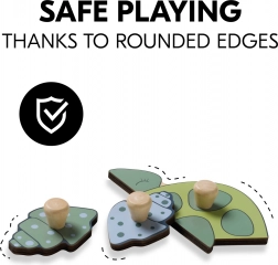 Každý dílek má dřevěný knoflík, který dětem usnadňuje zvedání a přesné vkládání na správné místo – ideální pro začátečníky.