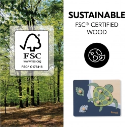 Hračka je vyrobena z FSC certifikovaného dřeva, takže je šetrná k přírodě a odolná pro každodenní hraní. Jemná paleta zelených a modrých tónů podněcuje zvědavost a zároveň působí uklidňujícím dojmem.