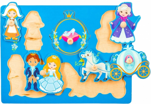 Tato dřevěná vkládačka s pohádkovým motivem Popelky je skvělou volbou pro první puzzle děťátka. Každý dílek má praktický úchyt, díky kterému se snadno drží a vkládá na své místo. Barevná deska slouží jako přehledné pozadí, které dítěti napovídá správné umístění dílků.