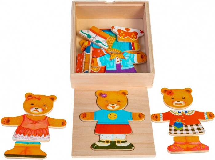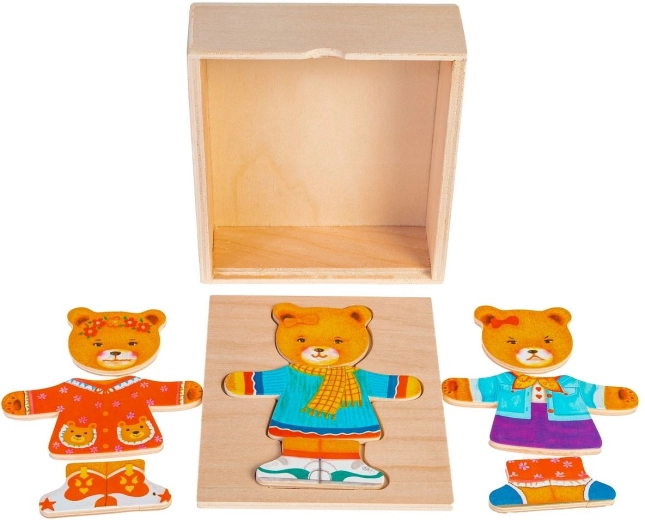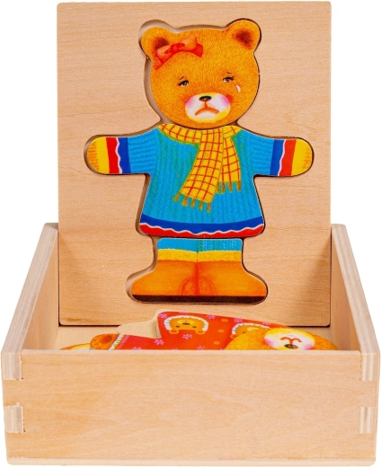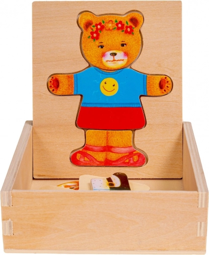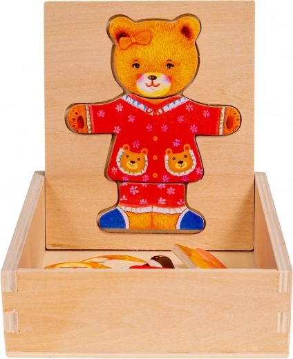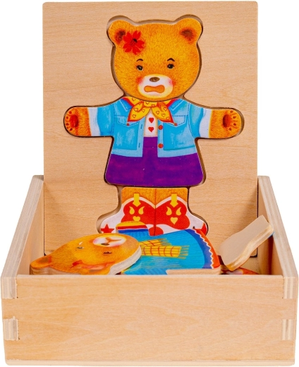 Dřevěná skládačka Medvídek holčička je barevná sada puzzlí, která umožňuje výměnu oblečení a nálady medvídka, což podporuje dětskou kreativitu a motorické dovednosti.