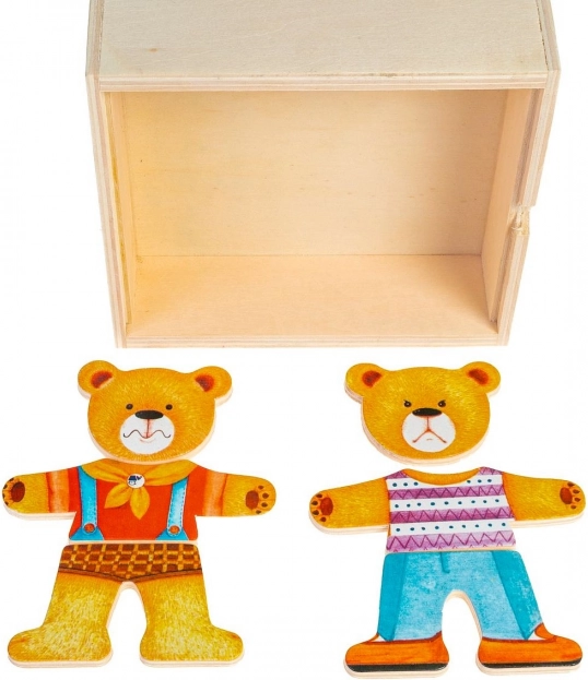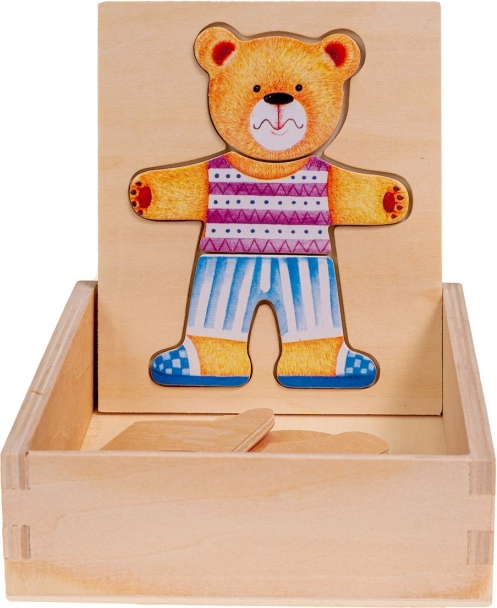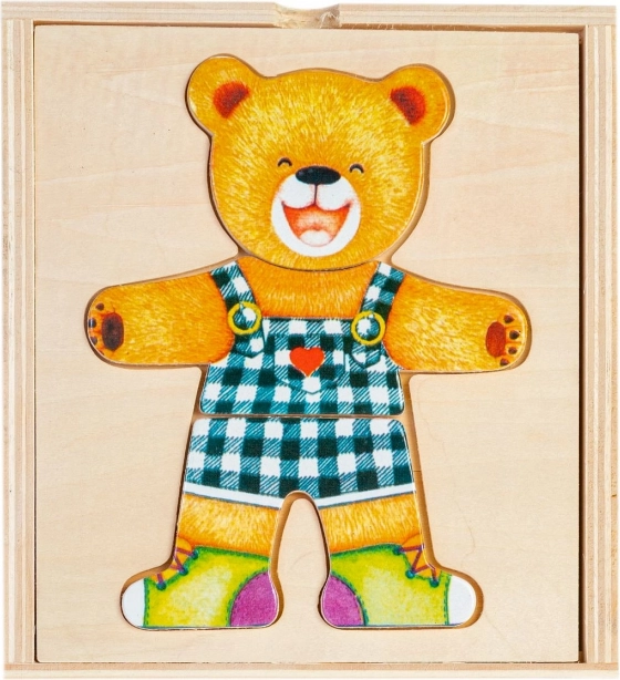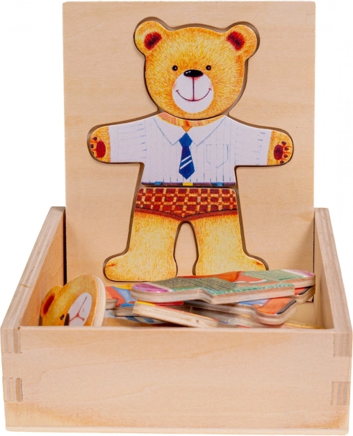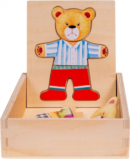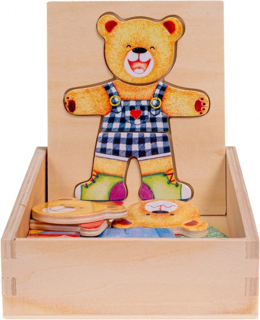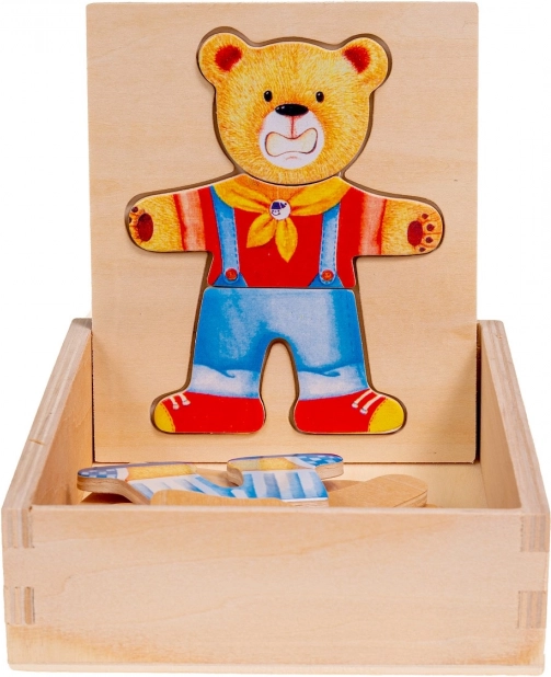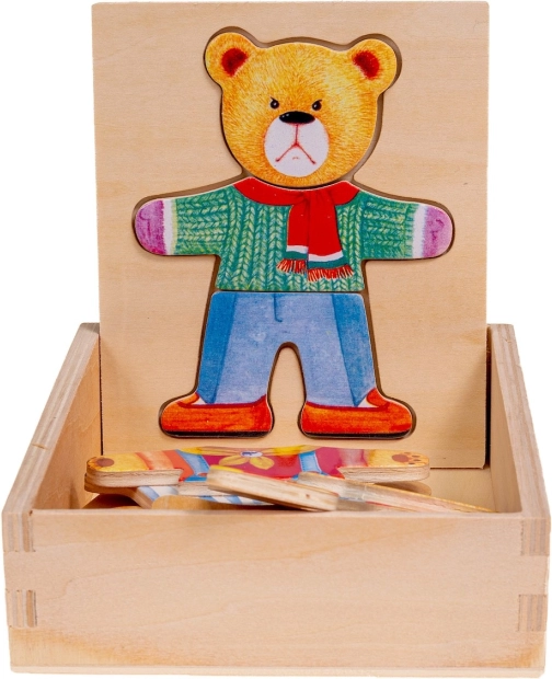 Dřevěné puzzle Medvídek nabízí zábavnou hru pro děti, která podporuje vývoj koordinace a jemnou motoriku. Děti mohou měnit náladu nebo oblečení medvídka pomocí různorodých puzzlí.