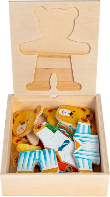 Dřevěná skládanka s motivem medvídka je zábavná hračka pro děti. Díky různorodým výřezům můžete medvídka obléct nebo změnit jeho náladu, což se dětem jistě zalíbí. Všechny dílky se pohodlně vejdou do dřevěného boxu, který slouží také jako podložka pro skládání.