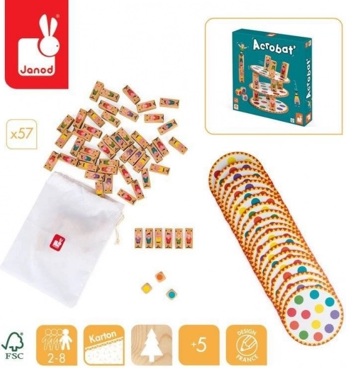 Set obsahuje 20 pevných kartonových plat s barevnými body, 57 dřevěných figurek akrobatů a 3 dřevěné kostky. Kvalitní francouzský design značky JANOD, praktický látkový sáček na figurky a estetická krabice dělají z této hry perfektní dárek.