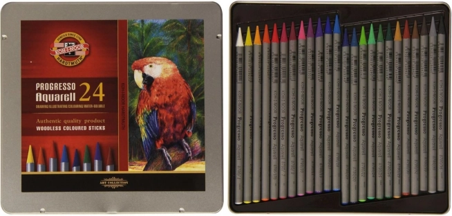 Souprava uměleckých pastelek Progresso Aquarell od značky KOH-I-NOOR nabízí 24 pastelů v elegantním plechovém pouzdře, ideální pro začínající i zkušené umělce.