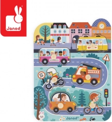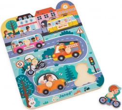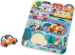 Dřevěné puzzle Ve městě značky Janod představují snadný a zábavný způsob, jak se děti mohou seznámit s různými dopravními prostředky. Tato set obsahuje 7 dílků: tramvaj, autobus, motorku, kolo, osobní automobil a hasičský vůz, vše na dřevěné desce s městskou scénou.