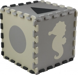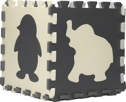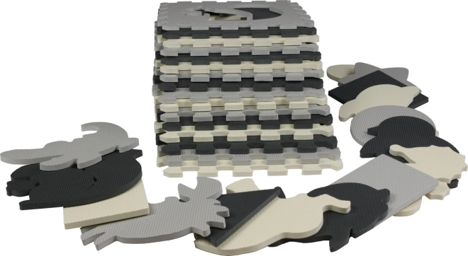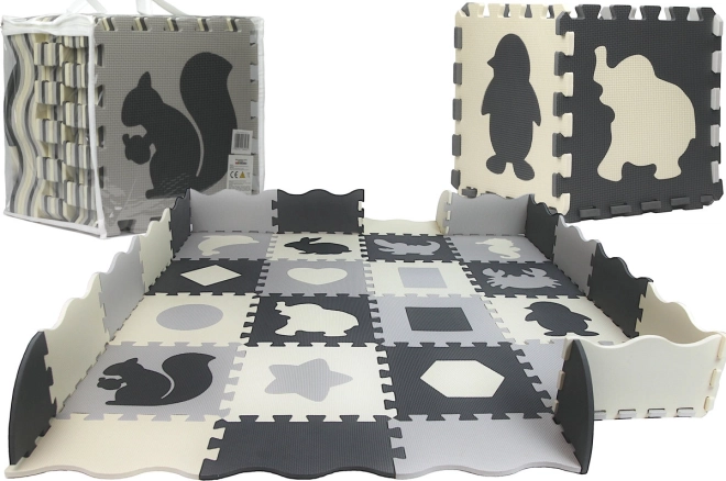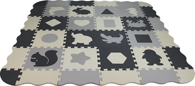 Tato šedo‑krémová pěnová puzzle podložka promění podlahu v útulné a bezpečné místo pro hru. Vyjímatelné středové dílky se zvířátky a geometrickými tvary podporují jemnou motoriku a učení formou zábavy. Díky tloušťce 0,9 cm příjemně tlumí nárazy i hluk a izoluje od chladu.