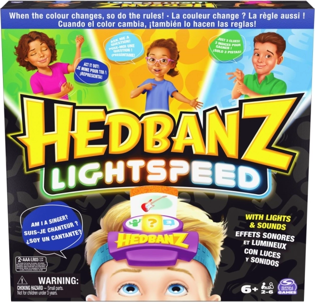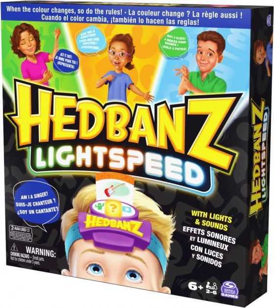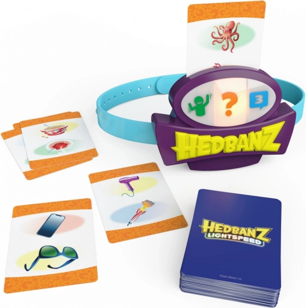Užijte si vzrušující hru Hedbanz Lightspeed, kde se pravidla neustále mění díky dynamické elektronické čelence s třemi barvami. Představte si scénku, odpovídejte rychlostí světla nebo použijte tři nápovědy podle toho, jakou barvu čelenka právě ukazuje.