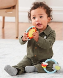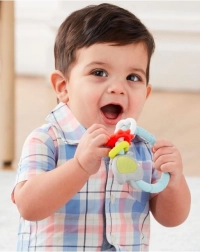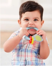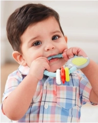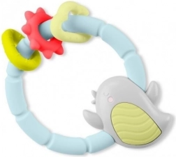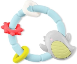 Tento barevný gryzáček ve tvaru ptáčka spojuje uklidňující úlevu při zoubkování s veselou smyslovou hrou. Měkký, šetrný silikon s různými texturami jemně masíruje dásně, zatímco chrastící kuličky a pohyblivé kroužky zaujmou sluch i zrak děťátka.
