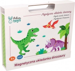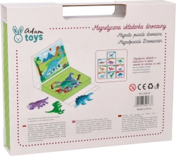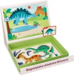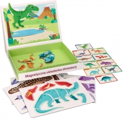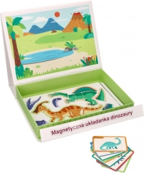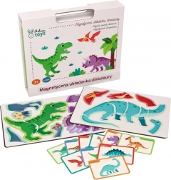 Obsah balení: magnetická tabule 26 × 19 cm, 10 barevných karet s vyobrazením a názvy dinosaurů a 51 magnetických dílků pro skládání. Výrobek je z bezpečných materiálů a splňuje normy CE.