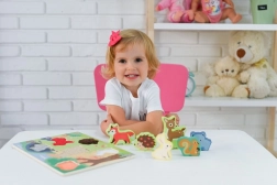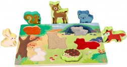 Tato kvalitní dřevěná skládačka s motivem lesních zvířat je navržená tak, aby malé děti zaujala barvami i tvary a zároveň je bezpečně provázela prvními krůčky objevování. Silnější 3D dílky se dobře drží v ruce a snadno se vkládají do výřezů na podložce.
