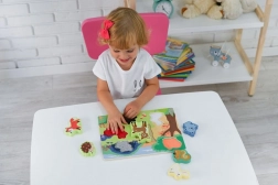 Díky odolnému lakovanému povrchu a hladkým hranám je hračka vhodná pro každodenní hraní. Podporuje koordinaci oko–ruka, trpělivost a soustředění, přičemž děti přirozeně poznávají zvířata z lesa.