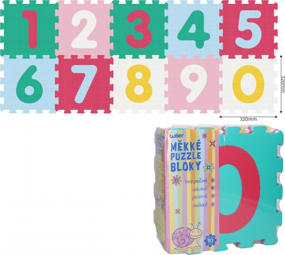 Měkké pěnové bloky s číslicemi 0–9 spojují zábavu a učení. Balení obsahuje 10 dílů o rozměru 32 × 32 cm s vyjímatelnými číslicemi, ideální pro procvičování čísel a rozvoj jemné motoriky.