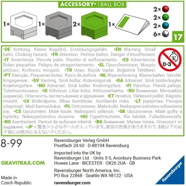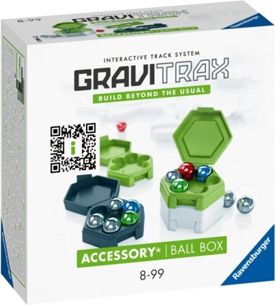V této GraviTrax sadě najdete 12 barevných kuliček: 6 stříbrných, 2 červené, 2 modré a 2 zelené. Kuličky lze uspořádat dle barev nebo je zamíchat podle vaší představivosti. Součástí sady jsou také 4 krabičky pro uspořádání kuliček - 2 zelené, 1 bílá a 1 šedá. Tyto krabičky lze skládat na sebe, což umožňuje skladování i v menších prostorech.