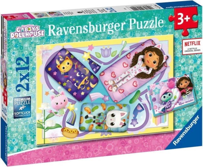 Puzzle 2x12 Kocourkův Dům Gabi od Ravensburger nabízí dvě skládačky, každá o 12 dílcích, ideální pro nejmenší fanoušky pohádek. Rozměry každého obrázku jsou 26 x 18 cm.