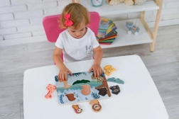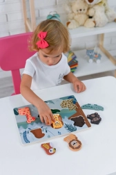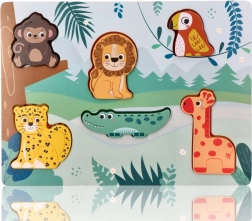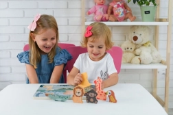Dřevěný 3D puzzle Safari Zvířata je ideální hračkou pro děti od 12 měsíců. Pomáhá rozvíjet kognitivní dovednosti tím, že děti skládají různé tvary zvířat do příslušných výřezů.