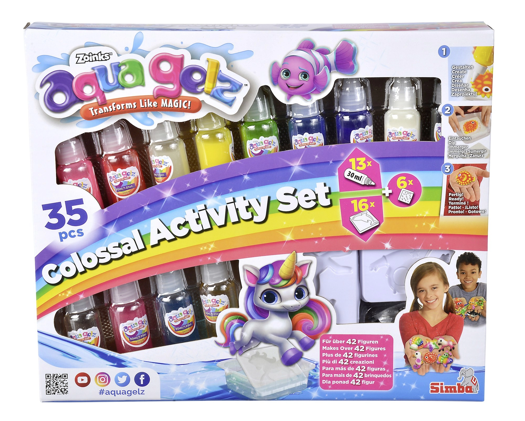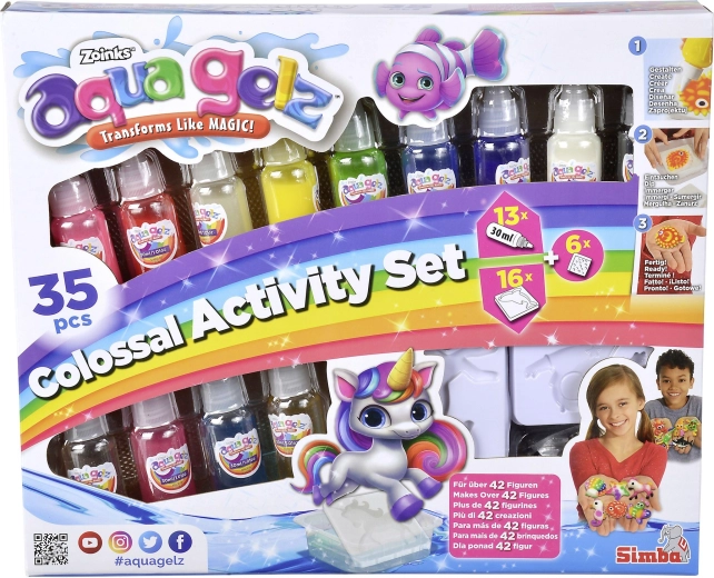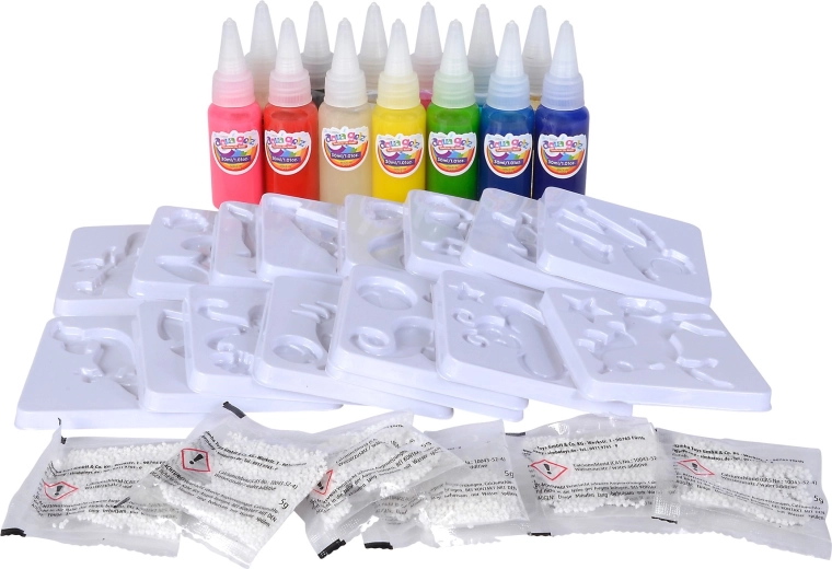 S velkou kreativní sadou Aqua Gelz děti snadno vytvoří vlastní barevné postavičky a dekorace. Postup je jednoduchý: rozmíchejte prášek v misce s vodou, vyberte motiv, vyplňte formu barevnými gely a jemně ponořte – během pár sekund vznikne plastická 3D figurka, která sama vyplave z formy.