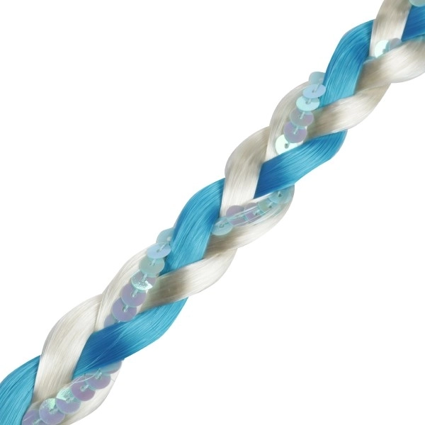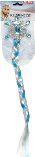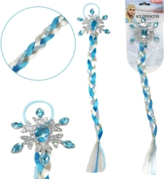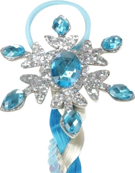 Příčesek copánek Ledová Princezna je vytvořen z modro-bílých pramenů, vyzdobený tematickými vločkami a flitry. Je snadno připevnitelný díky gumičce, čímž zajistí pohodlné nošení.