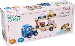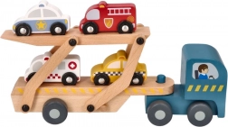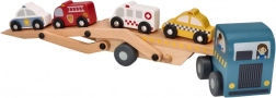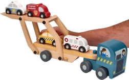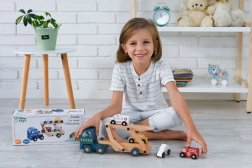 Tento dřevěný autotransportér nabízí skvělou zábavu pro děti díky své rozmanitosti a kvalitnímu zpracování. Obsahuje odnímatelný přívěs, který pojme čtyři roztomile zbarvená dřevěná vozidla.
