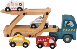 Sada obsahuje policejní auto, hasičský vůz, sanitku a taxi, všechny vyrobeny z kvalitního dřeva s detailními malbami.