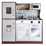 Součástí je kovové nádobí a náčiní: hrnec, pánev, poklice a 4 kuchyňské lžíce (naběračka, na špagety, cedník, naběračka na těstoviny). Vyjímatelný dřez umožní po hře „umyvat“ nádobí. Nadčasový design v kombinaci tmavé hnědé a bílé se hodí do každého dětského pokoje.