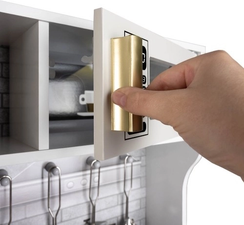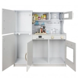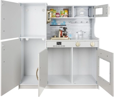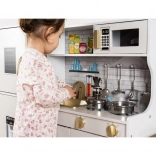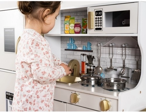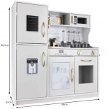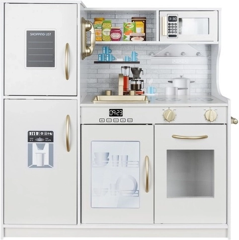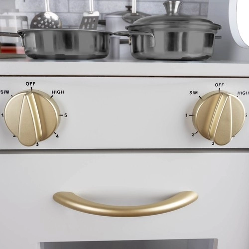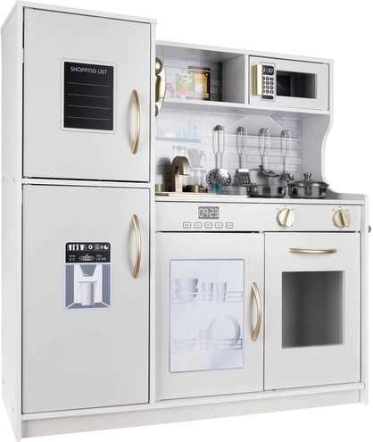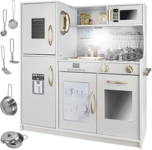 Tato dřevěná kuchyňka XL je navržena pro dlouhé hodiny zábavy. Integrované LED podsvícení umístíte dle libosti pod skříňku, do skříňky nebo do trouby a otočné přepínače s cvakáním navodí dojem skutečného vaření. Robustní MDF konstrukce a elegantní bílo‑zlaté provedení se stanou ozdobou dětského pokoje.