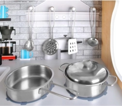 Kuchyňka je vyrobena z kvalitního dřeva, díky čemuž je stabilní, odolná a bezpečná. Součástí je bohaté kovové příslušenství – hrnec, pánev, poklice a 4 kuchyňské nástroje – a vyjímatelný dřez pro snadné „mytí“ nádobí. Neutrální design a barvy se hodí pro holky i kluky.