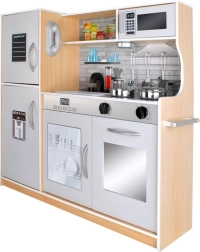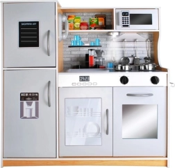 Stylová dřevěná kuchyňka XL s realistickými funkcemi pro malé kuchaře. Nabízí LED podsvícení, zvukové efekty knoflíků, vyjímatelný dřez a bohaté příslušenství. Díky pevnému dřevěnému provedení podporuje kreativní hru, rozvoj dovedností a bezpečnou zábavu každý den.