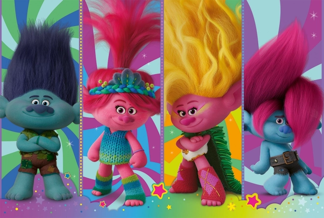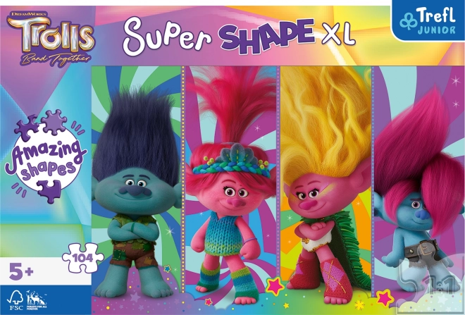 Veselé dětské puzzle s motivem Trollové nabídne 104 dílků ve větším formátu Super Shape XL pro pohodlné skládání. Po složení vznikne barevný obrázek o rozměru cca 60 × 40 cm, ideální pro rozvoj trpělivosti, jemné motoriky a představivosti.