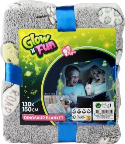 Hebká a hřejivá deka se vzorem dinosaurů, které ve tmě opravdu svítí. Stačí ji krátce nasvítit a užijete si kouzelný noční efekt, příjemný plyšový materiál a praktický rozměr 130 × 150 cm pro odpočinek doma i na cestách.