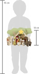Souprava zahrnuje dva stromky, stříšku s hvězdou, tři krále, pastýře, anděla, Marii, Josefa, Ježíška v jesličkách, tři velbloudy, osla, býka a dvě ovce. Betlém o výšce 18 cm je vyroben z kvalitního dřeva a je ideální pro rodinné tradice, rozvoj dětské fantazie i jako stylová dekorace na poličku či pod stromeček.