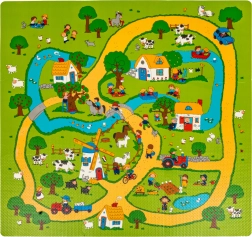 Objevte zábavnou pěnovou podložku s motivem Život na venkově, která vytváří bezpečný a podnětný prostor pro vaše děti. Sestavíte z ní čtvercovou hrací plochu s cestami, jezírky, stromy, budovami, větrným mlýnem, zvířaty, vozidly i postavičkami – perfektní kulisy pro hru s figurkami.